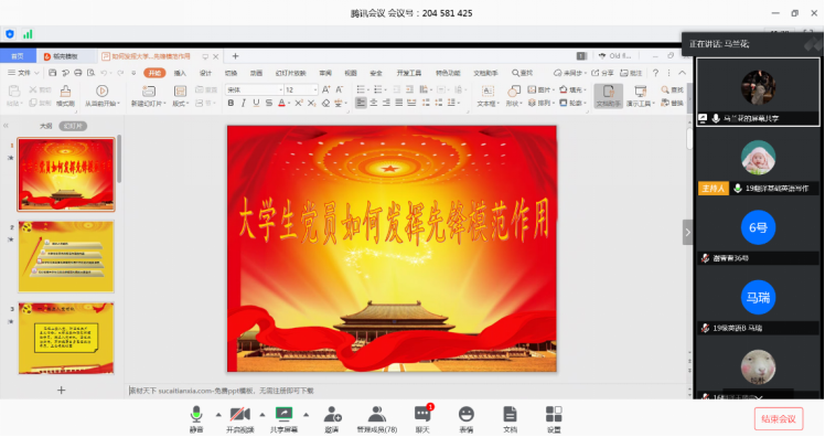 活动中,赵熠同志作了题为“初如槃�、使命在肩”的微党课,提醒广大党员不忘初心、牢记使命,在抗“疫”中展现党员先锋模范作用;马兰花同志就“大学生党员如何发挥先锋模范作用”进行阐述,带头做出遵守法律法规、校纪校规的承诺;张玲萍同志向发展对象、积极分子详细介绍了“入党流程”,号召大家认真学习党章、积极服务社会、提高自身素质,争取早日向党组织靠拢�