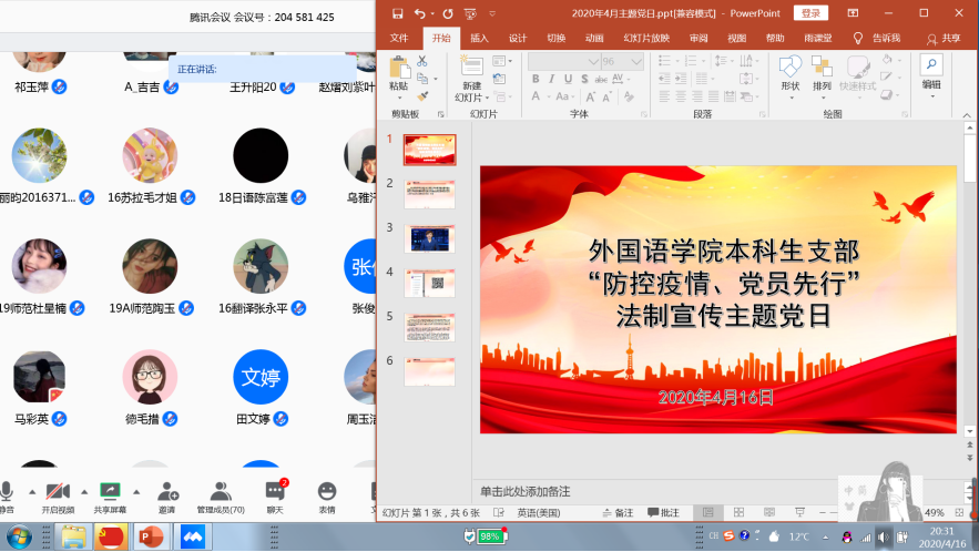 4�14日�22日,学院各级党组织开展了“防控疫情、党员先行”法治宣传主题党日活动,深入学习了习近平总书记在中央全面依法治国委员会第三次全体会议上的重要讲话精神和《中央全面依法治国委员会关于落实依法防控新型冠状病毒感染肺炎疫情切实保障人民群众生命健康安全的意见》精神,教育引导广大党员主动履行疫情防控义务和责任,不断增强“四个意识”,坚定“四个自信”,做到“两个维护”�