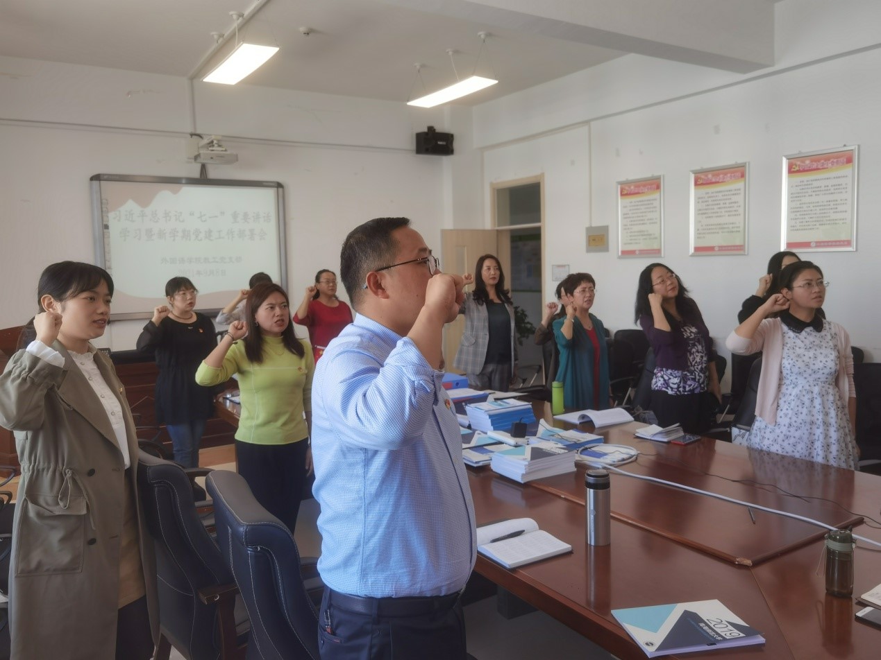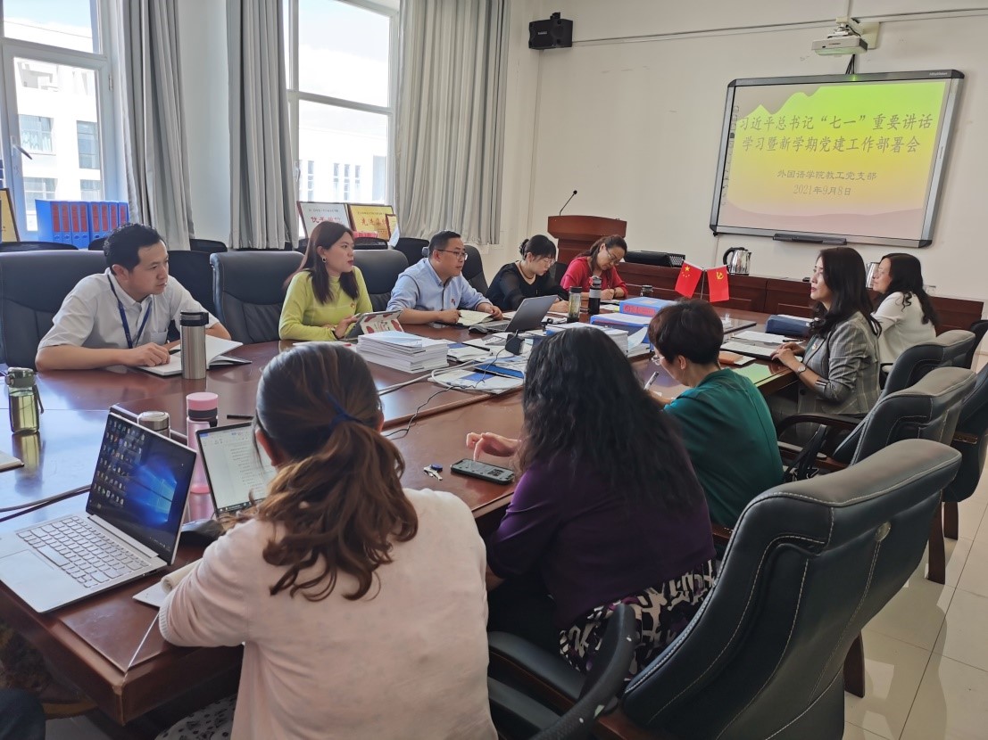 9�8日下午,外国语学院教师党支部在东二楼408会议室开展了以“学习习近平总书记‘七一’重要讲话精神,凝心聚力谋划学院党建工作新发展”为主题的党日活动,会议由教师支部书记妥洪岩主持,支部全体党员及预备党员参加�