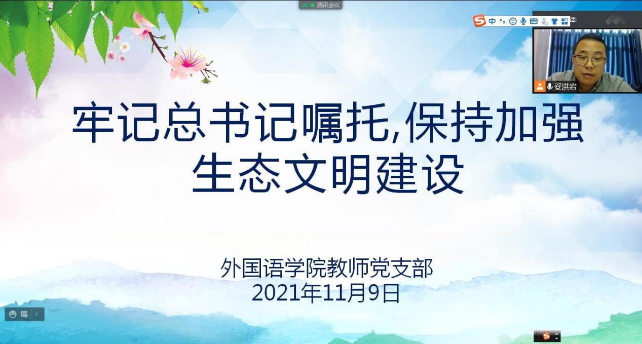 11�9日下午,根据支部学习计划,结合学院实际工作,外国语学院教师党支部在线召开了以“增强生态保护政治责任意识,保护青海生态安全”为主题的主题党日。会议由教师支部书记妥洪岩主持,外国语学院党总支书记马金芳,支部全体党员,发展对象、入党积极分子参加党日活动�