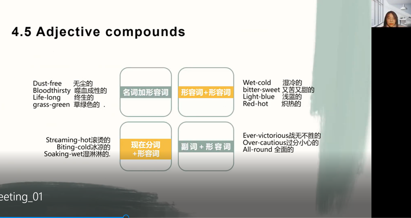 2022级学科英语研究生冯婷婷同学为大家� Morphemes and Morphological Process《词素与词的形成》的知识分享。通过她耐心细致地讲解,各位本科同学回顾了本科期间修习的语言学和词汇学的相关课程。她的讲解提到了大量的词汇构成知识,进一步扩充了大家的词汇量以及词汇学的相关知识。其全面查阅相关资料细心收集汇总制作PPT,使参会的师生颇受启发�