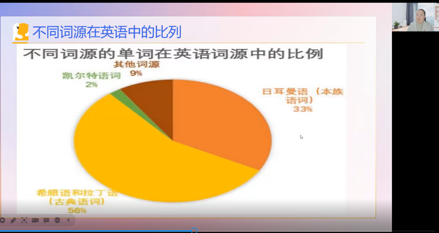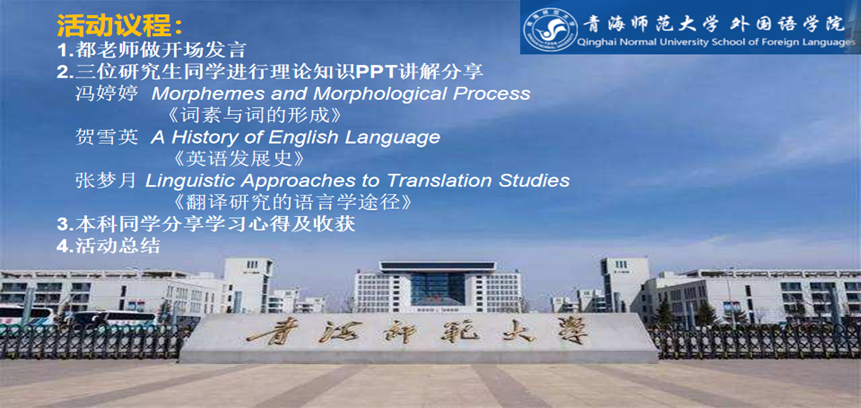 2022级学科英语研究生贺雪英同学为大家做了 A History of English Language《英语发展史》的知识分享。她精彩的讲述让同学们从英语的起源、英语发展的四个时期和英语的与时俱进三个方面对英语发展史有了系统深入的了解�