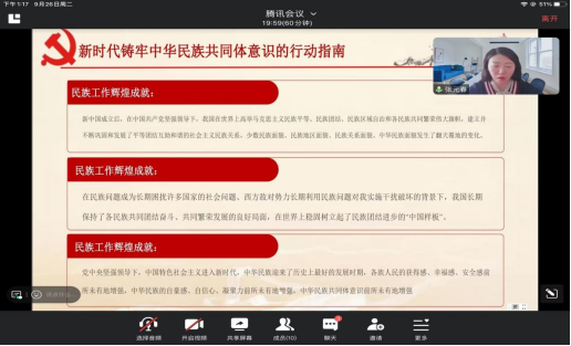 9�26�下午13:00�青海师范大学外国语学院研究生党支��线上线下结合的方�围绕“铸牢中华民族共同体意识”开展了主题党日活动�外国语学�全体研究生党员参加会议,�支部委员常永洁同�主持�