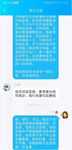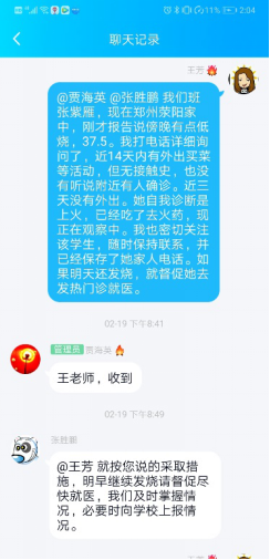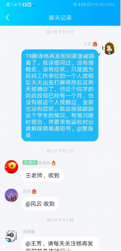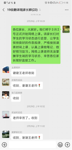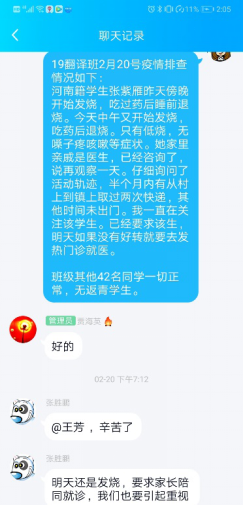 在做好疫情防控工作之外,她也一如既往地做好与学生的谈心谈话工作。假期中,有同学家庭发生了矛盾,她认真聆听学生的倾诉,在情绪上进行安抚和疏导;有的同学感情受挫,她又化身知心大姐,帮助同学走出心情低谷。当注意到有同学因为延期开学及网络授课而出现焦虑和不满情绪时,王老师深入了解同学们遇到的问题,给出解决问题的建议和意见,帮助排解负面情绪,做好防疫动员宣传工作�