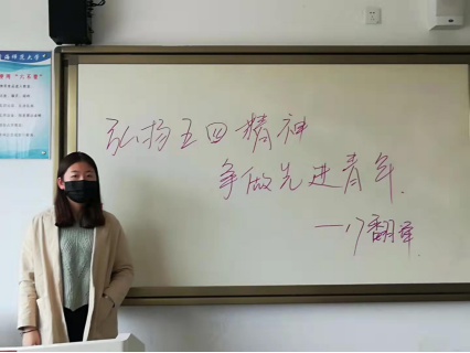 17翻译�19师范B等班级通过线下形式开展了团学活动,团支书为大家讲述了爱国与进步对弘扬五四精神的重要性,他说��五四精神概括起来就是爱国、进步、民主、科学,虽然五四运动已经100周年了,但仍然需要我们青少年提倡和发扬。”同时鼓励大家,作为青少年一定要不断进取、一直向上。今天社会经济发展的脚步很快,但是爱国和进步仍然是每一位青年同志心中永恒不变的主题�