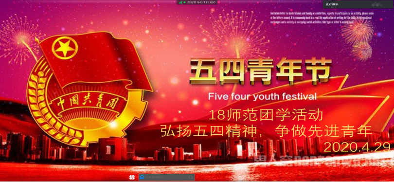活动中,18英语师范�19翻译等班级通过腾讯会议,集中学习了五四精神的相关资料,并以微课形式对于"五四精神"内容进行了全面的理解和交流,研讨中,同学们积极分享、交流,大家一致认为作为当代青年团员应当秉承民族精神,肩负时代责任,及时抓住机遇,将个人理想和祖国联系起来,争做新时代的追梦人�