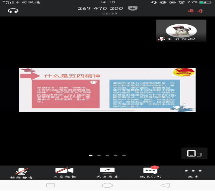 本次主题团学中,各班通过各类新颖、充��生动的形式,�大家发出�”传承五四精神,让青春在新时代绽放“的号召,各团支书带领同学们重温了入党誓词、学习了团歌�18翻译�18日语等班级通过腾讯会议的线上方�开�团学�大家争先恐后发表自己的观点,例如如何发扬五四精神�如何成为更好的自��如何成为时代新人等。讨论中,每个人都把“爱国,进步,民主,科学”的五四精神深深的印在了脑海里,这种精神会一直陪伴着同学们,在未来的人生路上助力远航�17翻译�19师范B班等班级通过线下形式开展了团学活动,在班级里的同学通过讨论�交流的方�开展团学,虽然带着口罩�但通过眼神依然可以看见他们对知识的渴望,在五四精神的学习中,每个人都获益匪浅,在团支书的带领学习下,我们每一位同学都有了自己的小目标,为成为时代新人而努力奋斗�