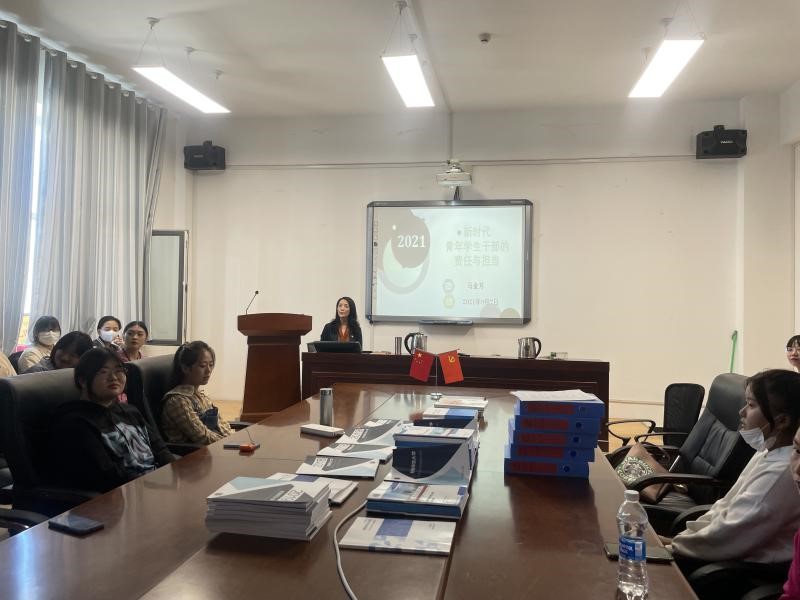 9�7日下午学院党总支书记马金芳以“新时代学生干部的责任与担当”为主题作了专题讲座。会议上马书记讲座主题层次分明,引用习近平总书记对青年学生的寄语,向学生干部讲述了新时代青年承担着怎样的责任与担当。并且强调了担当精神是时代新人的重要品质,同时以个人的成长经历让同学们明白了担当精神的重要性。书记鼓励各位学生干部要敢于承担,勇于担当,做新时代的追梦人。鼓励大家尤其学外语的同学们要有坚定的理想信念,坚持文化自信,弘扬中华文化的主旋律,讲好中国故事。赋予大家深切期望,能够在未来的学习生活中坚定政治立场。书记在会议的最后对所有青年学生干部提出了六点希望:第一,青年学生干部要做政策的引领者。第二,青年学生干部要做思想的引领者。第三,青年学生干部做活动的组织者。第四,做舆论的宣传者。第五,青年学生干部做有效的沟通者。第六,青年学生干部做利益的维护者。在马书记的悉心教导和鼓励下,同学们感受到了学院的温暖与关怀,相信各学生干部一定会积极履责,团结同学、服务同学,使每位同学都能够在外国语学院这个大家庭中茁壮成长�