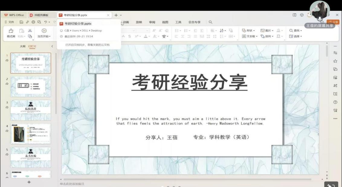 随后,21级研究生朱凯琴同学就背诵记忆和答题思路详细分享了自己切实的心得体会,鼓励本科生们通过考研提升自我。如在进行专业课背诵时,通过框架和关键词记忆梳理内容,充分利用碎片化时间达到高效记忆。她说:“考研过程中要相信自己是最棒的那个,相信每一份努力都会成为一束光,照亮你前行的路。任何事在下定决心的那一刻起,就笃定的走下去,最后你所憧憬的梦想会随着时间的推移而成为现实。”显然,了解做题技巧和答题思路可增加同学们的备考信心。