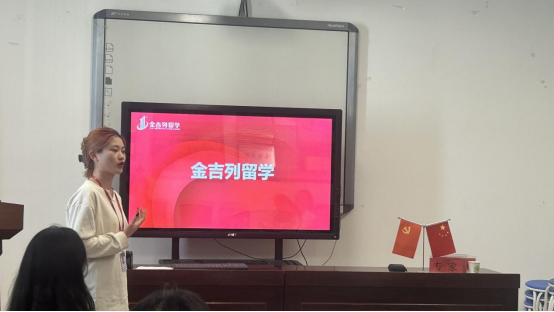 首先,辅导员巩鲜妮老师依次向大家介绍参会人员,同学们表示热烈欢迎。简单地介绍之后,巩老师向金吉列留学的几位老师介绍了我们学院的一个基本情况,包括发展历史、师资力量、专业设置等各个方面,还播放了我院宣传片,让金吉列留学的各位负责人有更深入的了解。