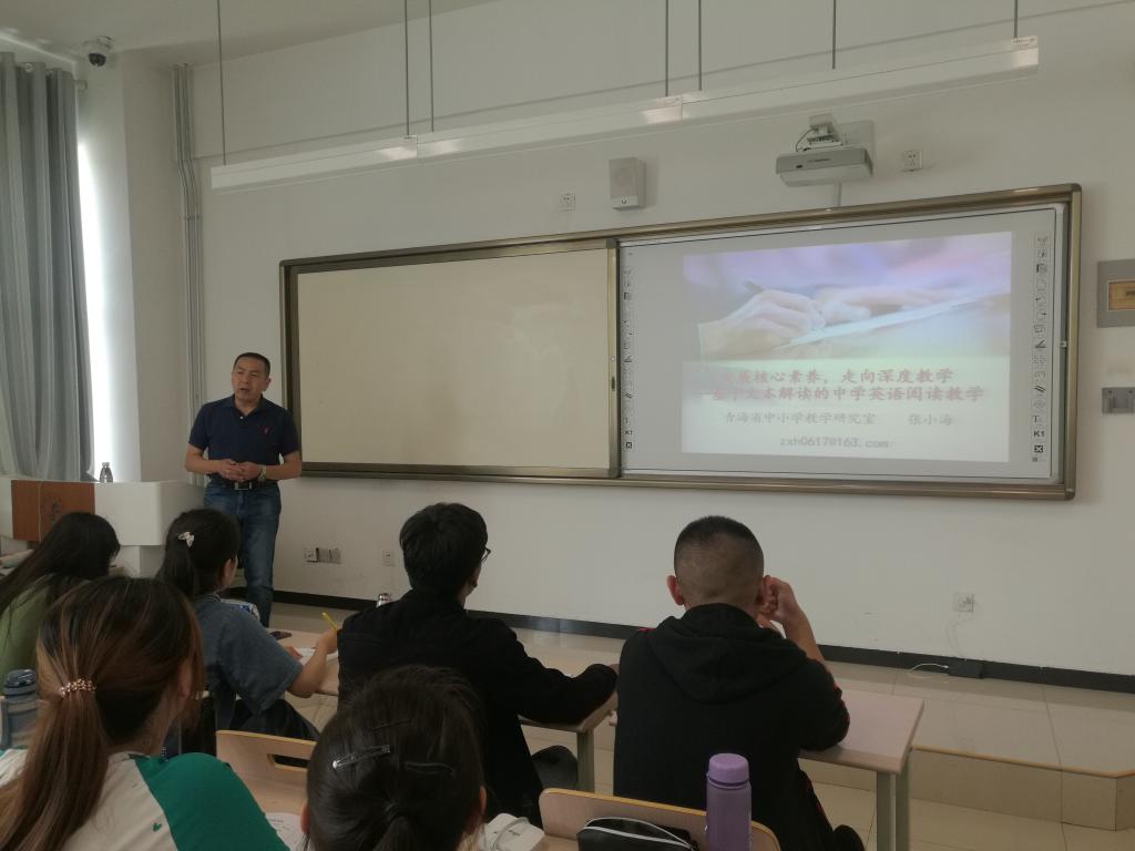 为贯彻落实全国教育大会和全省教育大会精神,依托对口支援高校资源,青海师范大学广泛邀请对口支援高校、国内知名高校教授及省内外著名专家来我校进行学术交流。根据学校夏季小学期工作实施方案,外国语学院邀请了省内英语教学界的专家�省内英语教学名师对三年级师范类学生开设卓越教师实训课程�2019�7�15日,我校首个夏季小假期正式开课。应外国语学院邀请,青海省中小学教学研究室英语教研员�青海省省级名师工作室主持人张小海老师为我院师生开设了《发展核心素�、走向深度教�》的讲座�