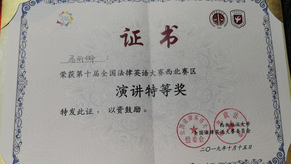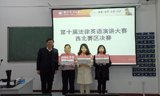 经过逾两个小时的激烈角逐,我校外国语学院选送的2019级研究生马丽娜(上图左二),以新颖的选题,娴熟的演讲技巧以及纯正流利的英语�30多位选手中脱颖而出,最终以第一名的成绩荣获西北赛区演讲大赛特等奖,将与甘肃政法大学及西北政法大学的两名学生共同代表西北赛区参加法律英语演讲大赛的全国总决赛�