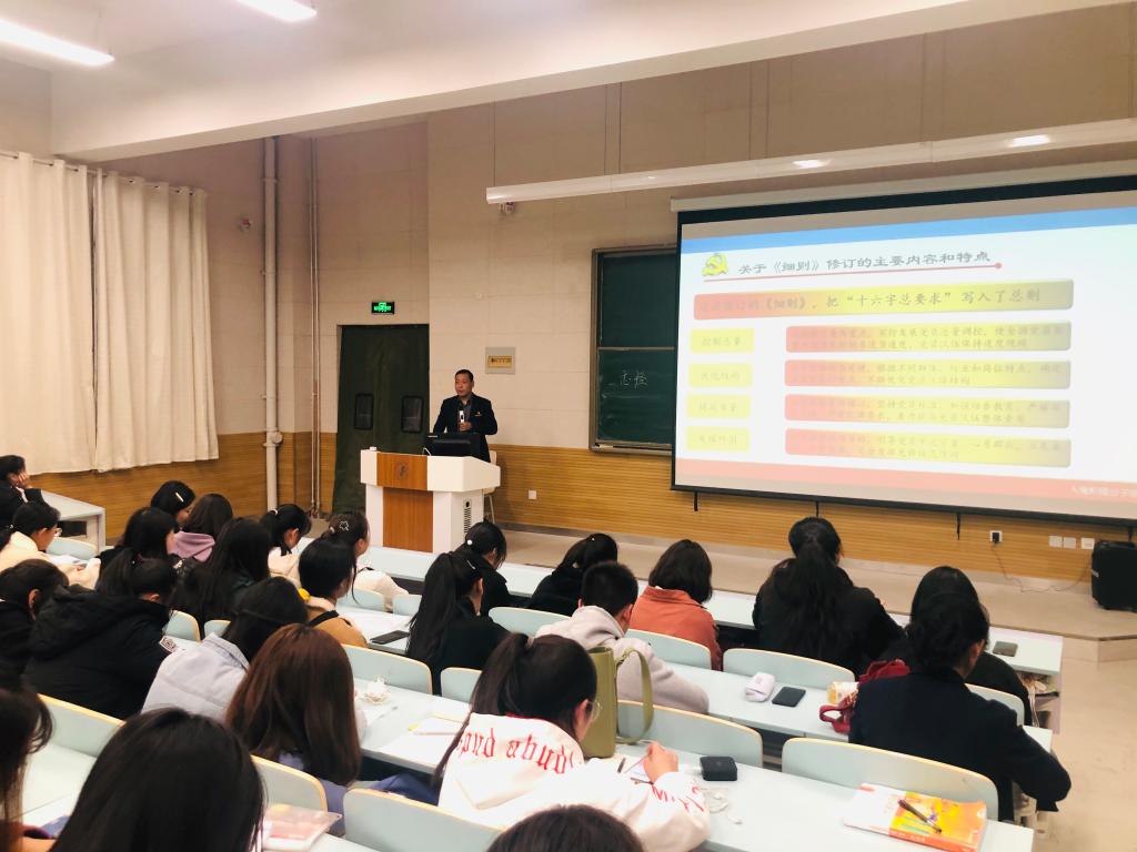 讲座中,张胜鹏同志围绕《中国共产党发展党员工作细则》修订背景、重大意义、主要内容和特点、各章节的具体内容,从申请入党、入党积极分子的确定和培养教育、发展对象的确立和考察、预备党员的接收、预备党员的教育考察和转正等五个方面对大学生入党的基本程序进行了详细的介绍。他强调,广大青年朋友应该自觉以党的指导思想作为自己的行动指南,用习近平新时代中国特色社会主义思想武装自己、提高自己,努力学习科学文化知识,争做“有理想,有本领,有担当”的新时代合格大学生,争取早日加入党组织�