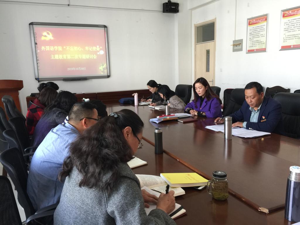 10�30日,外国语学院党总支召开“不忘初心,牢记使命”主题教育第二次专题研讨和第七次集中学习会,院党总支委员、各支部书记、全体教工党员参加了会议�