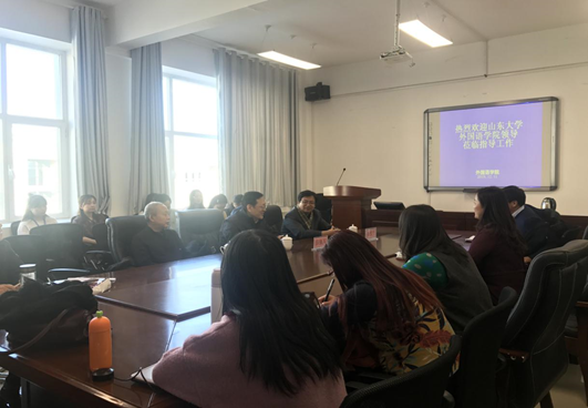 12�11日下午,山东大学外国语学�常务副书记薛佩军、副院长崔校平、组织员周俊基一行三人到访外国语学院,与我院开展座谈会,商谈对口支援事宜,落实2020年对口支援计划,学院全体教师参加座谈会�