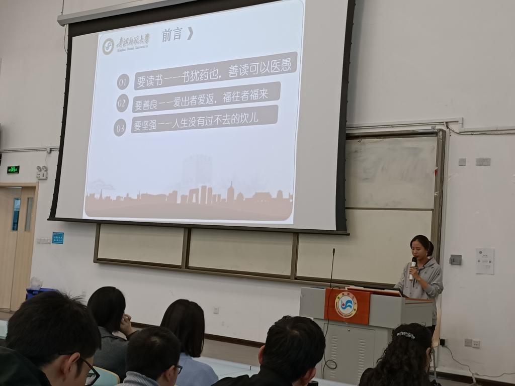 宣讲会上,四位同学分别从个人简介、获奖情况、学习态度、社会实践四方面分享了他们的大学业余生活分配、学习方法以及获奖心得等感悟体会。索南永尕和李艳梅同学分别结合自身经历,从学习、工作、社会实践等方面讲述了她们的学习经验以及丰富多彩的社会实践活�; 马桂福同学以“师范生成长之路”为题分享了他参与师范生技能大赛、学术研究以及社会实践的经验;赵伟同学结合自身获得国家奖学金的经历,告诉同学们学习的重要性,鼓励每个人建立自己的远大目标,朝着自己的目标前进,同时,也分享了她担任学生干部的经历与感悟。最后,辅导员贾海英老师鼓励大家向四位宣讲人学习,刻苦努力,珍惜大学生活,积极参加各项活动,并在大学生活中找到属于自己的道路�
