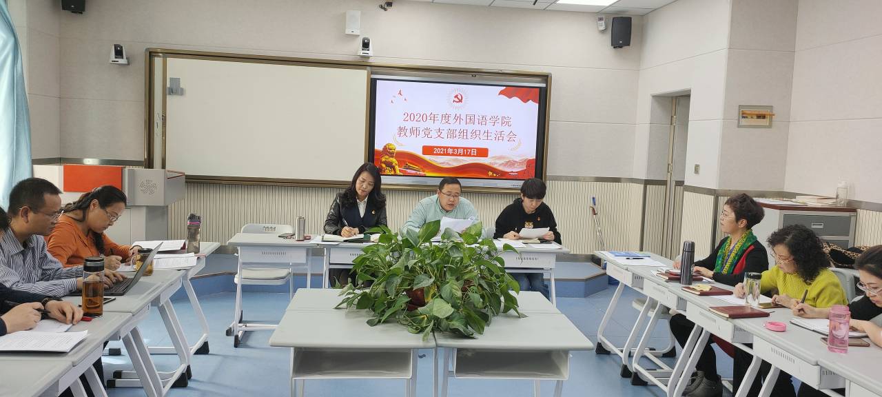 3�17日下午,外国语学院教师党支部召开�2020年度组织生活会暨民主评议党员大会。会议由党支部书记妥洪岩主持,全体党员参加会议�