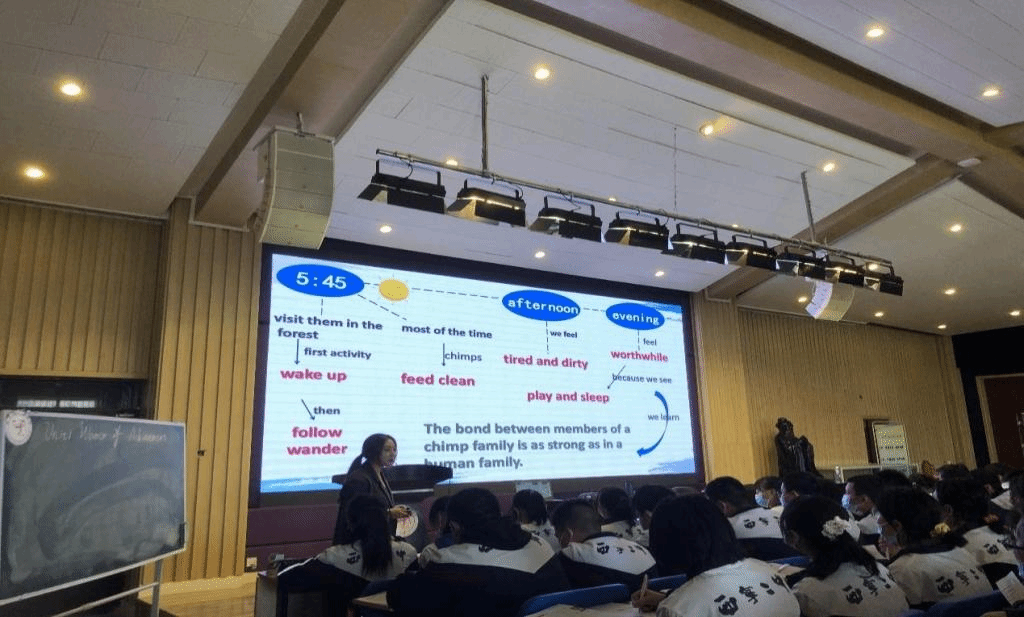 随后,由马玲雅老师为我们带来了和张永霞老师同样话题的不同特色的一堂课,马玲雅老师则采用了传统阅读课的步骤即pre-reading、while-reading、post-reading进行教学。读前先通过让学生观看关于Jane Goodall的采访视频,以此充分激发了学生的阅读兴趣,激活了学生关于主题语境的已有相关知识;读中以问题为导向,引导学生通过阅读获取段落大意,引导学生完成时间轴,最后让学生自己提出关于Jane Goodall有关问题并做出回答,培养学生批判性思维能力;读后活动中,通过引导学生对Jane Goodall所具有的优良品质进行总结,运用小组活动实现学生对于本次语篇的创新,指引学生获得了Greatness comes from commoness的意识,实现了本次课程在情感上的升华�