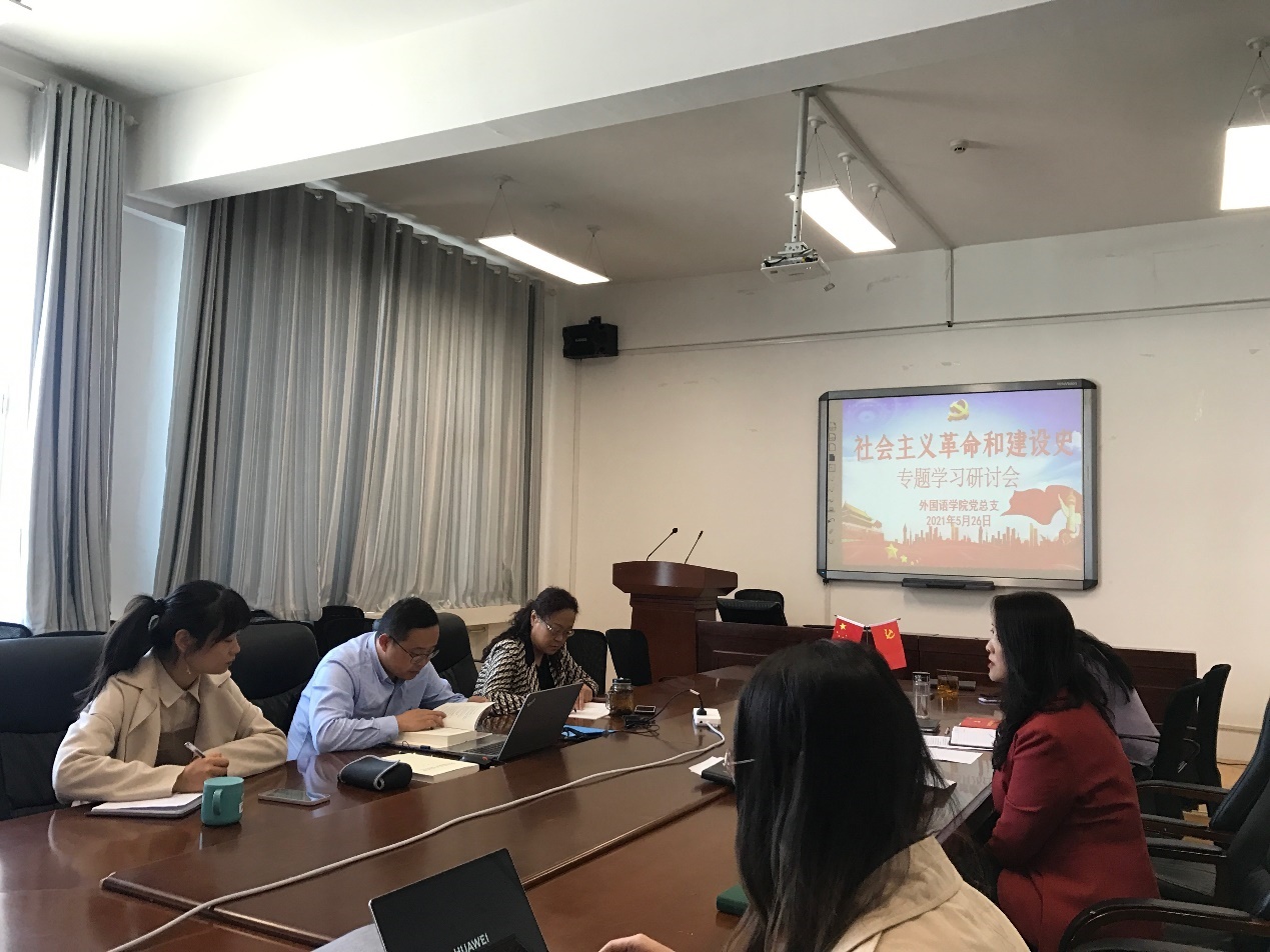 根据学院党史学习教育领导工作计划�5�26日上午,外国语学院党总支召开进行“社会主义建设和革命史”专题学习研讨,马金芳同志主持会议,总支委员及部分教师代表参加研讨会�
