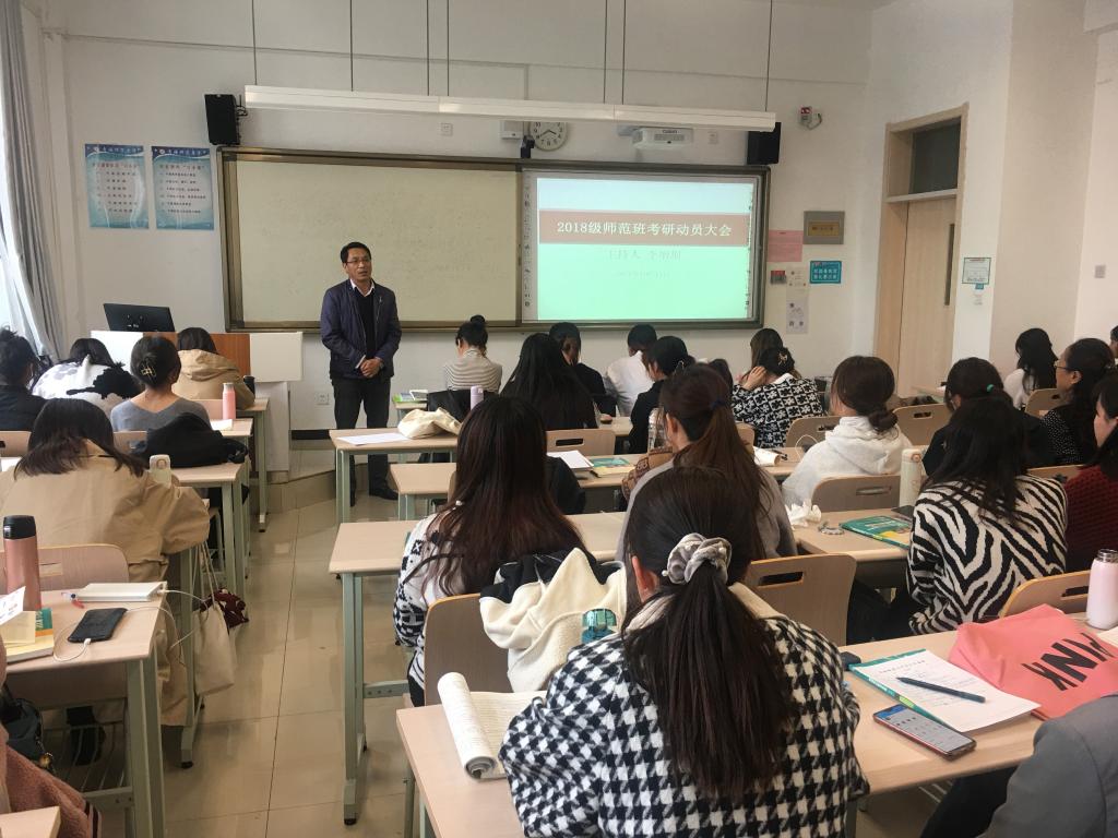 为更好地调动我院学生考研积极性,帮助学生确立考研目标,增强学生考研信心,坚定学生考研决心,提升学生考研非智力因素竞争力�10�14日下午,2018级师范班学生在东二楼418教室召开考研动员会�
