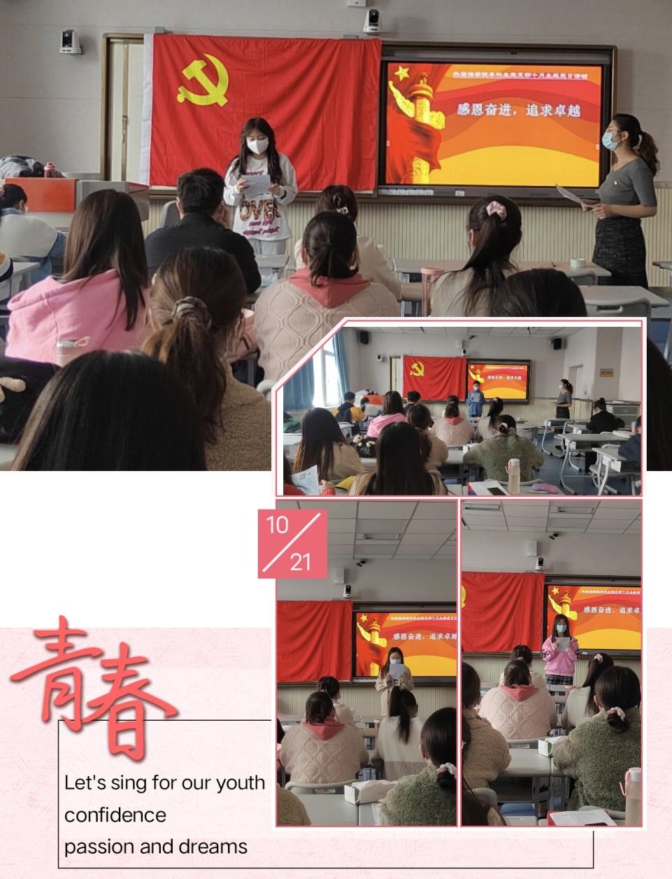 10�21日中午,外国语学院本科生党支部在东二417教室举行了十月份的主题党日活动。本次的活动围绕“感恩奋进,追求卓越”主题展开,由本科生支部书记刘洋老师主持,全体党员参加�