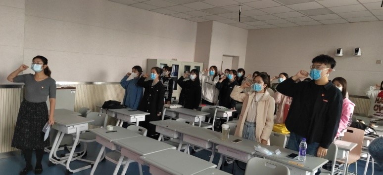 活动伊始,刘洋老师强调疫情期间安全防疫的重要性,要求每一位学生党员提高防范意识,严格按照我校新冠肺炎疫情防控工作部署,不仅做好自我防范,更要发挥党员的先锋模范作用,带领班内同学做好疫情防范工作。随后,全体学生党员重温入党誓词并进行理论学习�