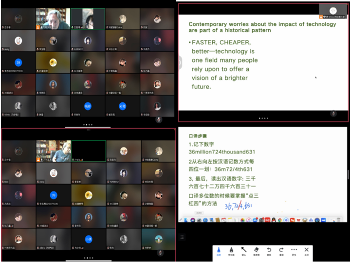 口译课作为翻译班级的专业课,对教师线上授课能力以及对硬件设备的要求较高。籍天璐老师与同学共同努力,顺利在线上进行音频材料的播放并对“腾讯会议”的平台功能进行深入探索。将腾讯会议中的书写功能当作黑板,学生可以实时与老师沟通和交流的。在讲解“数字翻译”时,同学们可以在屏幕上边记笔记边翻译,一方面能够让学生直观的感受到翻译过程,同时也能让老师随时掌握学生对于该课程的接受程度�