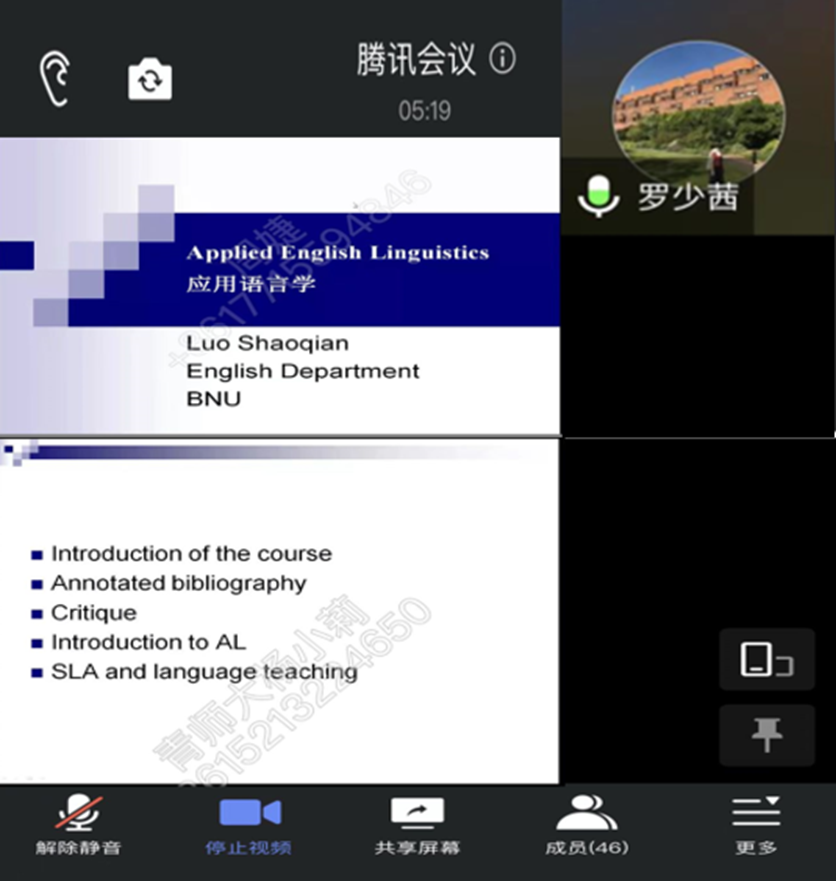4�19日早�8点,我院2021级研究生通过腾讯会议平台同步分享北京师范大学外国语言文学学院英文系罗少茜教授的研究生课程《应用语言学》,同学们十分珍惜这次学习机会,早早等侯在线上课堂中,课堂氛围严肃又活泼,学生参与度高,该课程让同学们对应用语言学有了新的认识,产生了浓厚的学习兴趣�