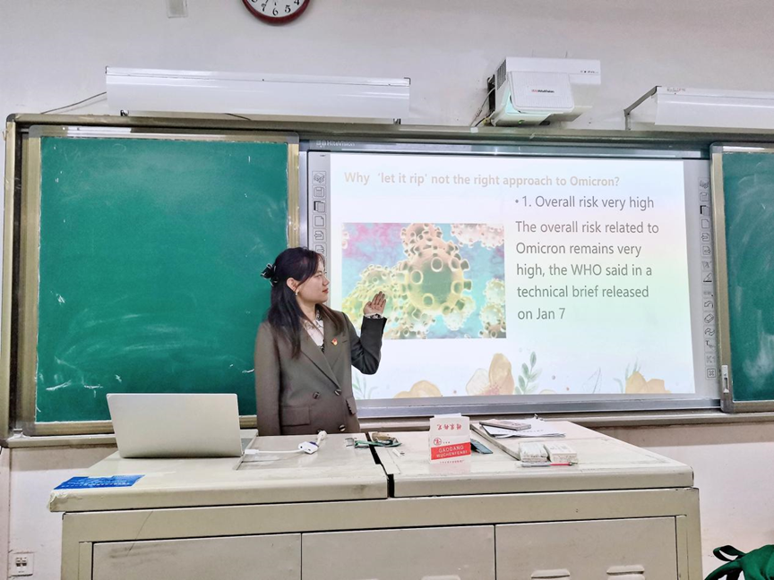支部书记籍天璐作了题为《面对奥密克戎,为什么不能“躺平”》中英双语微党课。党课讲述了面对疫情不能“躺平”的原因,奥密克戎总体风险非常高,对易感群体威胁大,同时接种疫苗可有效降低病死率。双语微党课的学习不仅有助于大家提升专业能力,而且也有助于增强防疫意识,认识到防疫的重要性�