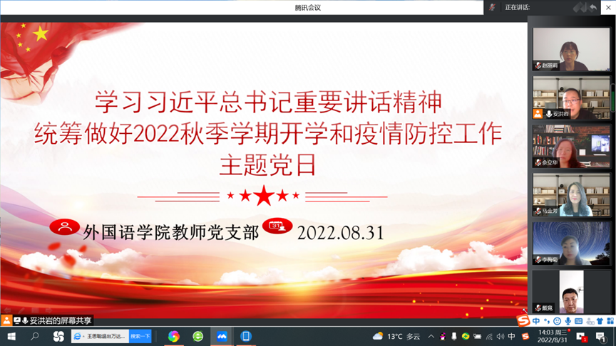 8�31日下午,外国语学院教师党支部线上开展以“学习习近平总书记重要讲话精神,统筹做好2022秋季学期开学和疫情防控工作”为主题的主题党日活动。活动由教师支部书记妥洪岩主持,外国语学院党总支书记马金芳及支部全体党员参加�