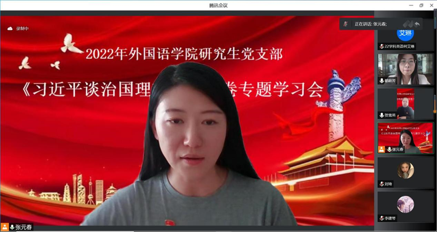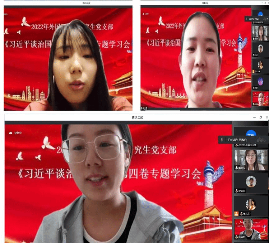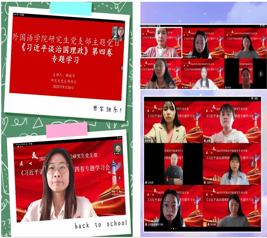 9�26日下�14:00,青海师范大学外国语学院研究生党支部采用线上会议形式开展《习近平谈治国理政》第四卷专题学习。外国语学院研究生全体党员参加会议,会议由研究生党支部书记都庭芳老师主持�