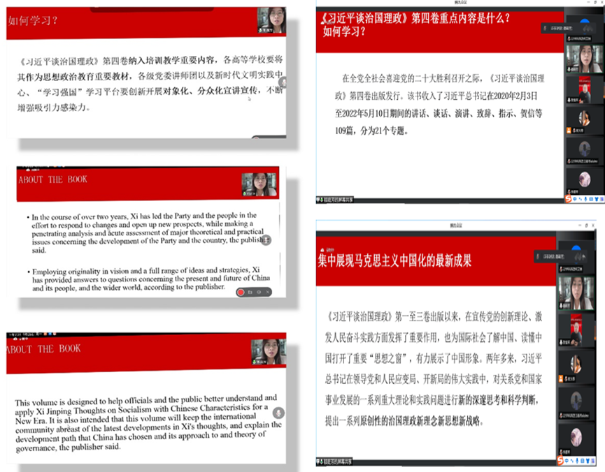 会议第二项由都老师讲解本学期第一堂党课。内容主要以中英文的双语形式详细介绍了《习近平谈治国理政》第四卷:为使国际社会了解中国、有力展示中国形象做了生动诠释,《习近平谈治国理政》集中展现了马克思主义中国化的最新成果,充分体现了党为推动构建人类命运共同体、共建美好世界做出的最新贡献,是全面系统反映习近平新时代中国特色社会主义思想的权威著作�