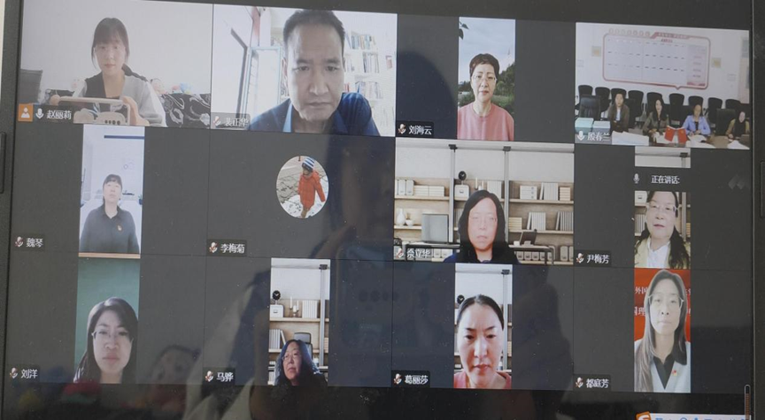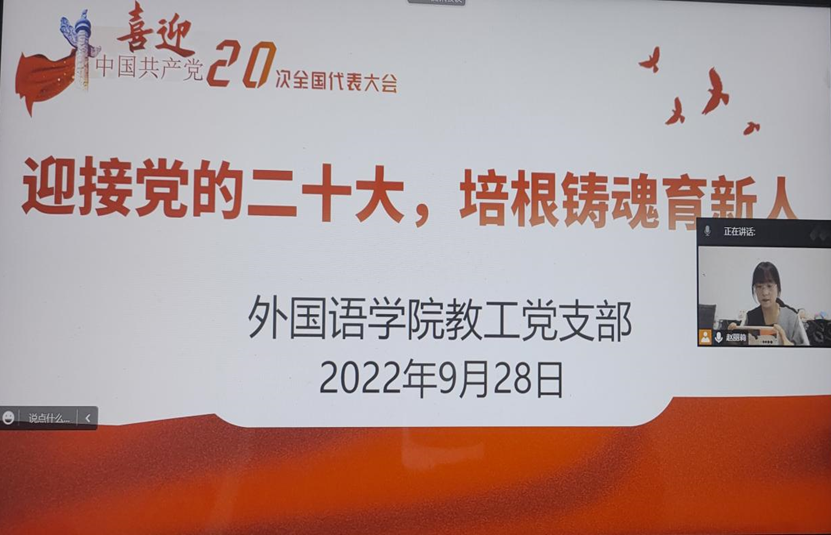 9�28日下午,外国语学院教工党支部采用线上线下相结合的方式召开了以“迎接党的二十大,培根铸魂育新人”为主题的主题党日活动。会议由教工支部宣传委员赵丽莉主持,外国语学院党总支书记马金芳及支部全体党员参加�