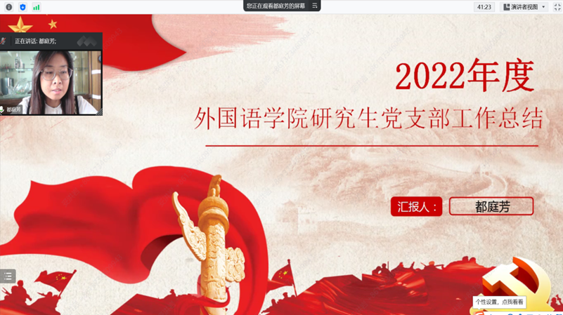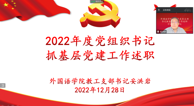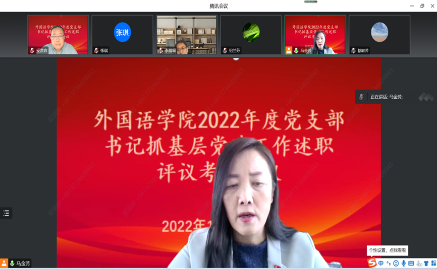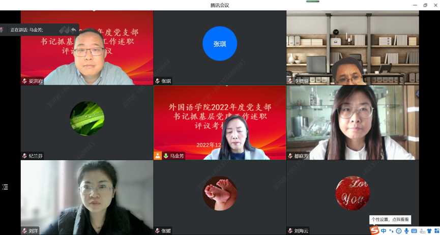 为认真学习宣传贯彻党的二十大精神,进一步落实“四个主体责任”, 强化党支部的政治功能和组织功能,及时检验支部党建工作情况,并对下一年度工作做好进一步的工作部署�12�28日下午,外国语学院党总支在线组织召开2022年度党支部书记抓基层党建工作述职评议考核会暨12月教工党支部主题党日活动,总支委员、三位党支部书记、委员和全体教师参加了述职考评会议,会议由总支书记马金芳主持�