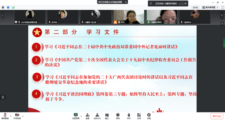 陶玉同学以视频和文件的方式领学了《习近平同志在参加党的二十大广西代表团讨论时的讲话》及《习近平同志在瞻仰延安革命纪念地的重要讲话》,讲话强调要以党的二十大精神为指引,用党的科学理论武装青年,用党的初心使命感召青年,做青年朋友的知心人、青年工作的热心人、青年群众的引路人。继续深入学习贯彻习近平总书记关于青年工作的重要思想,努力培养有理想、敢担当、能吃苦、肯奋斗的新时代好青年�