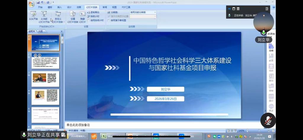 为做�2026年国家社科基金项目申报工作,1�26�19:30-21:30,北京航空航天大学外国语学院刘立华教授应邀,通过腾讯会议平台在线为我院教师作题为《中国特色哲学社会科学三大体系建设与国家社科基金项目申报》专�讲座。讲座由学院副院长韩青玉主持��院全体教师参加�