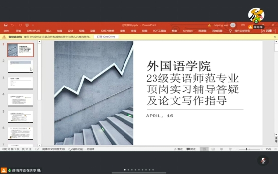 4月16日外国语学院通过腾讯会议平台开展23级英语师范专业顶岗实习辅导及论文写作指导活动,活动由薛海萍老师主持。