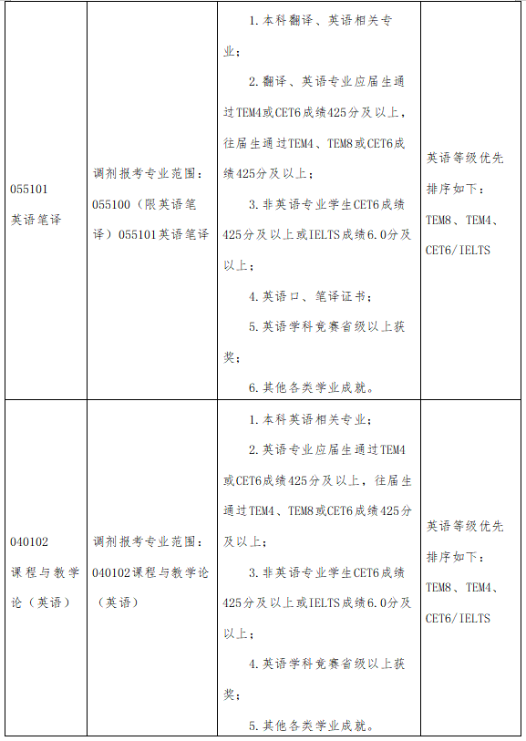 2.调剂考生的第一志愿报考专业应与我院拟接收调剂复试的专业相同相近,且在同一学科门类;或初试科目与调入专业初试科目相同相近,其中初试全国统一命题考试科目(统考科目与调入专业统考科目相同。在全国统一命题科目中,201 英语一、204 英语二可视为相同;考生初试统考科目涵盖调入专业所有统考科目的,视为相同。
