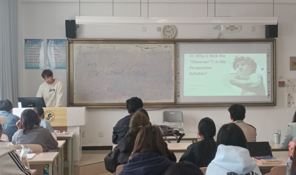 为激发同学们的阅读兴趣,促进深度思考,帮助同学们从不同角度解读文本,提升批判性思维,推动知识的内化和实践, 5�12��24级英�C班举办了关于The Great Gatsby的读书分享会。同学们分为六组,对以下主题进行了分析和讨论�