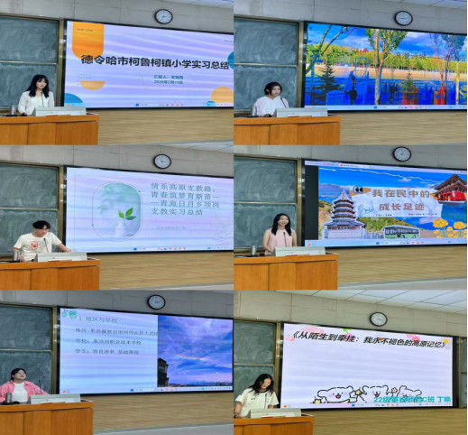 随后,22级三个班的六位同学分别上台分享了自己的顶岗支教经历。来自22A班的支锦霞和马秀芬同学在德令哈支教,她们从多样的角度阐述了此次支教遇到的困难,以及自己克服困难之后的收获。来自22B班的肖丁硕同学在湟源县日月藏族乡中心学校,马晓彤在化隆县民族中学支教,他们为我们讲述了多民族学校的特点、自己面对多民族学生群体时采用的多样教学方法,以及如何把民族团结意识融入教学之中。来自22C班的丁艳和吴建清同学的支教地点在果洛州玛沁县,他们讲述了学生的真诚、善良、与淳朴,和初入高海拔地区工作的适应过程。