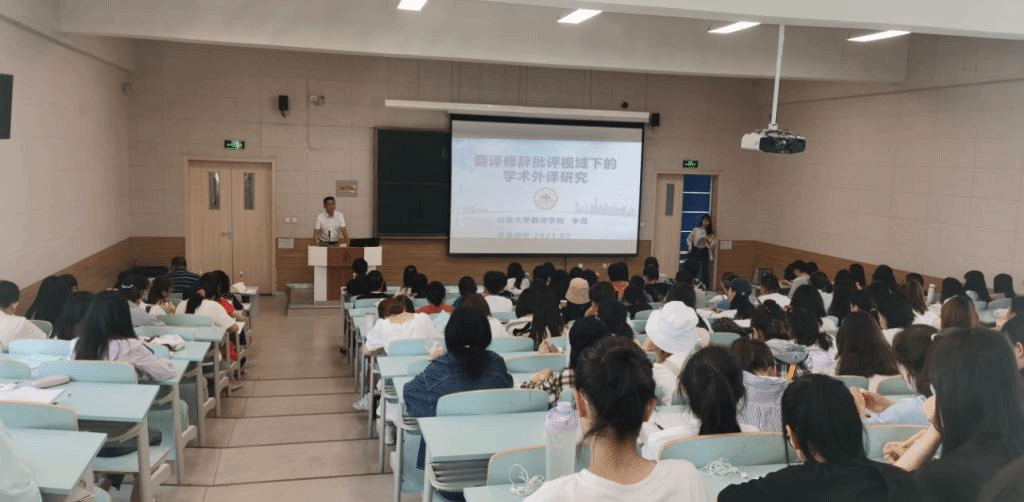 7月17日上午,山东大学翻译学院李克教授在E2-0101教室为外国语学院200余名师生以“翻译修辞批评视域下的学术外译研究”为题做学术讲座,讲座由文学翻译教研室主任张卿副教授主持。