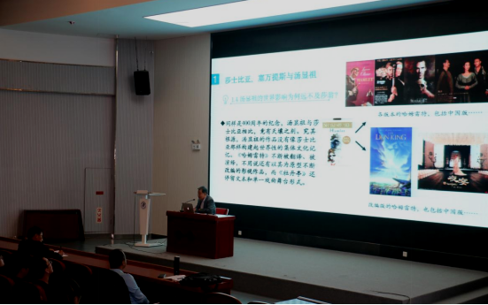 罗选民教授首先引入“全世界开展莎士比亚、塞万提斯和汤显祖逝世400周年的纪念活动三个具体案例,表达了自己的文化传播观点:翻译需要多方协作,多角度思考翻译与文化传播的关系“大翻译”的视野看待中国文化“走出去”成为当代外语人的主导翻译观。罗选民教授将同一时代的伟大作家汤显祖和莎士比亚进行了对比分析认为汤显祖的世界影响远不及莎翁的根本原因在于前者的作品没有建立起世界的集体文化记忆,而仅仅是停留在本土的文化记忆和单一的戏曲舞台形式中。