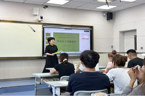 接着,杨老师根据《英语专业毕业论文选题指南》展开讲解。她先阐述了毕业论文的战略意义,强调其质量直接反映学生的学术素养和研究能力,同时介绍了包含选题创新性(30%)、文献扎实度(15%)等在内的六大评价指标。之后,详细讲解了科学选题与文献管理的方法,包括跨学科融合、技术赋能的语言研究等创新性选题的四个突破口,以及文献筛选、批判性阅读和脉络整合的具体方式。在论文结构与写作规范方面,解析了IMRaD结构各部分的要求和学术英语表达要点。还介绍了研究方法与数据分析的关键操作,如混合研究设计的应用和数据分析的实操陷阱;强调了学术规范与伦理的底线要求,包括引用规范和学术不端的红线;分享了高效写作与时间管理的策略,如甘特图逆向规划、模块化写作等。