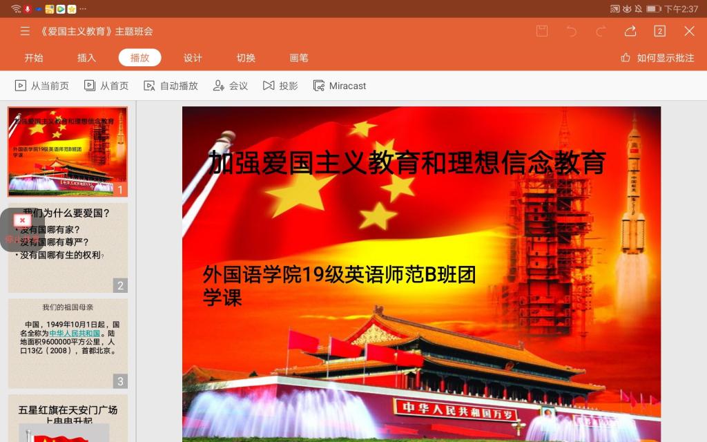 对标主题,讲授微课。为进一步确保同学们对主题的深刻理解、提升支部成员的思想意识,每班团支书动员两位同学进行有关团日主题的微课讲授。17级日语专业其更提到“爱国主义是一种精神现象,其思想观念对形成一个民族的凝聚力和向心力具有重大影响,是一个民族之魂。作为一名大学生,我们应从自身作起,从细节作起,注意自己的言行,理智地去认识当前国际形势,努力学习文化知识,锻炼我们的意志,掌握为国家为人民服务的本领。”