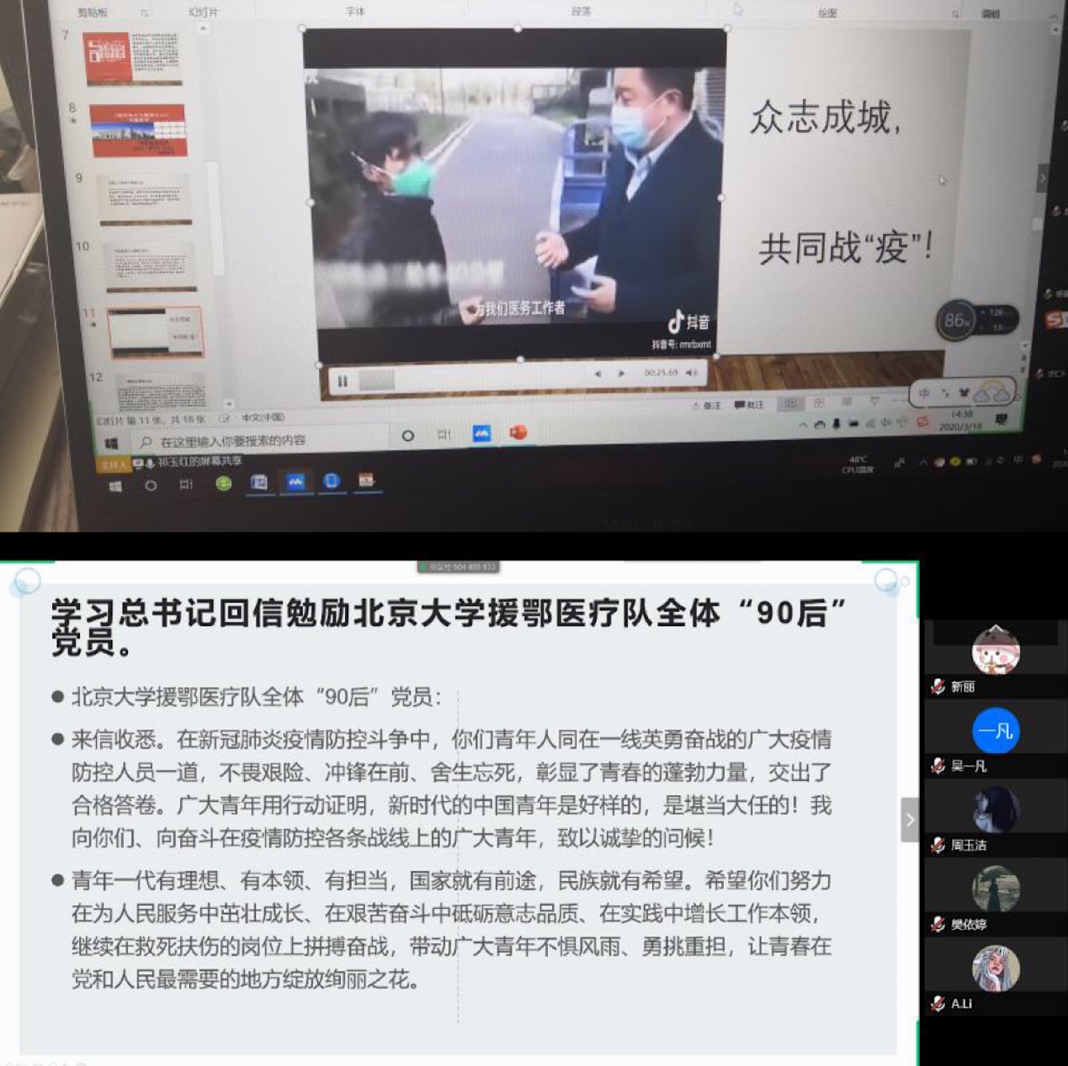 开展爱国主义教育学习。活动中,各团支书带头组织全体学生通过新闻报道、电视视频、典型案例等形式学习了疫情期间各地的先进事迹,教育引导大家深刻认识“一方有难,八方支援”的中国精神。重点学习了习近平总书记给北京大学援鄂医疗队全体“90后”党员的回信。“在新冠肺炎疫情防控斗争中,你们青年人同在一线英勇奋战的广大疫情防控人员一道,不畏艰险、冲锋在前、舍生忘死,彰显了青春的蓬勃力量,交出了合格答卷。”习近平总书记的谆谆嘱托,激励着广大青年勇挑重担,为打赢疫情防控阻击战贡献力量,让青春在党和人民最需要的地方绽放绚丽之花。