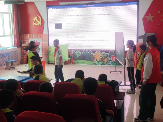 课堂开始时,我先带领孩子们认读了剧本中的英语生词,“Monkey King”(孙悟空)、“White Bone Spirit”(白骨精)等。孩子们热情高涨,踊跃跟读,发音清晰准确。随后,我组织他们分组练习台词,并鼓励他们大胆表达。令人欣喜的是,孩子们不仅快速掌握了新词汇,还能灵活运用于对话中。