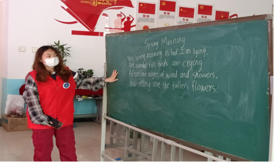 1.具体内容:志愿者先播放英语版《春晓》古诗歌曲音频,引导学生回忆之前学过的内容。随后组织集体演唱歌曲与朗诵古诗,同时根据学生身高和表现力排好队形。演唱时,志愿者带领学生加入手势动作,通过多次练习让大家熟练掌握;朗诵环节则先逐句进行发音、节奏的强化训练,再连贯朗诵整首诗,最后进行完整的集体展示,过程中不断纠正细节,确保呈现效果。