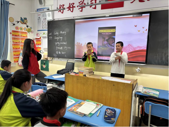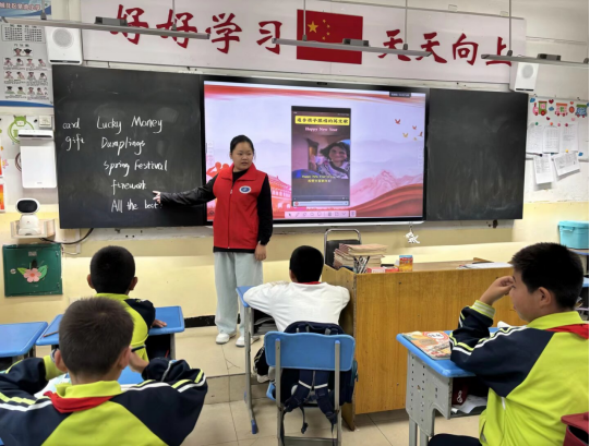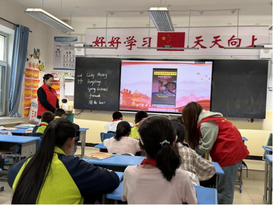 926,青海师范大学外国语学院本科生党支部志愿者走进西宁市城北区泉湾小学,开展 “语泉相助,荧光相行” 英语歌曲教学志愿服务活动。本次活动以经典英文歌曲《Happy New Year》为载体,通过歌曲教唱与互动游戏相结合的方式,让小学生在轻松愉快的氛围中提升英语语音语调的准确性,增强英语学习的兴趣,同时在集体互动中培养节奏感与协作能力。