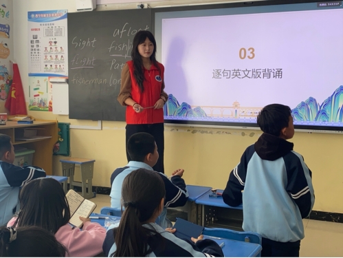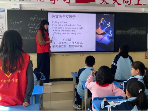 20251017日,外国语学院本科生党支部志愿者前往西宁市城北区泉湾小学,开展“语泉相助,荧光相行”诗歌教学志愿服务活动。活动以英文版《江雪》为教学内容,通过诵读、释义、背诵与创意演绎相结合的方式,引导学生感受英语语言之美,体验诗歌意境,提升语感与记忆能力,实现英语学习与传统文化感知的双向融合。