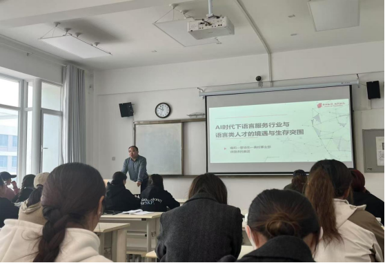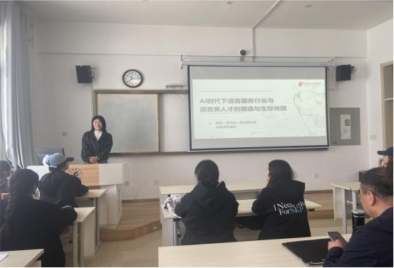 2025411日,外国语学院特邀译国译民集团语言业务培训主管雍老师在城北校区东一楼报告厅作题为"AI时代下语言服务行业与语言类人才的机遇与生存突围"专题讲座。本次讲座由翻译专业负责人、文学与翻译教研室主任马吉德老师主持,2023级翻译专业全体学生及教研室教师共60余人参加。